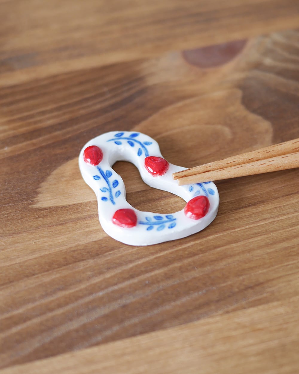うねうねとした可愛らしいフォルムに、小花柄をあしらった箸置きです。