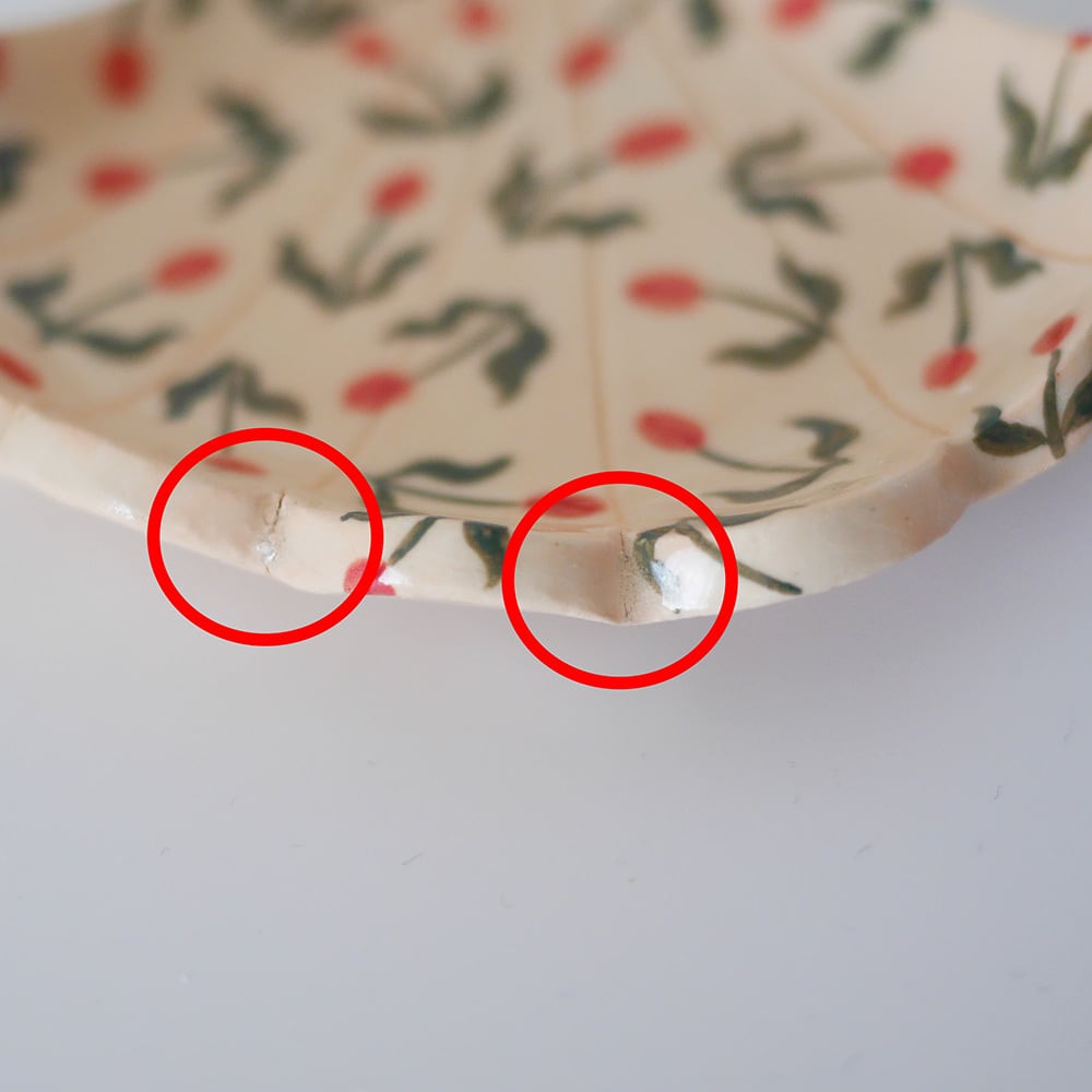 写真2枚目の赤丸部分に、2箇所の小さなヒビがございます。
