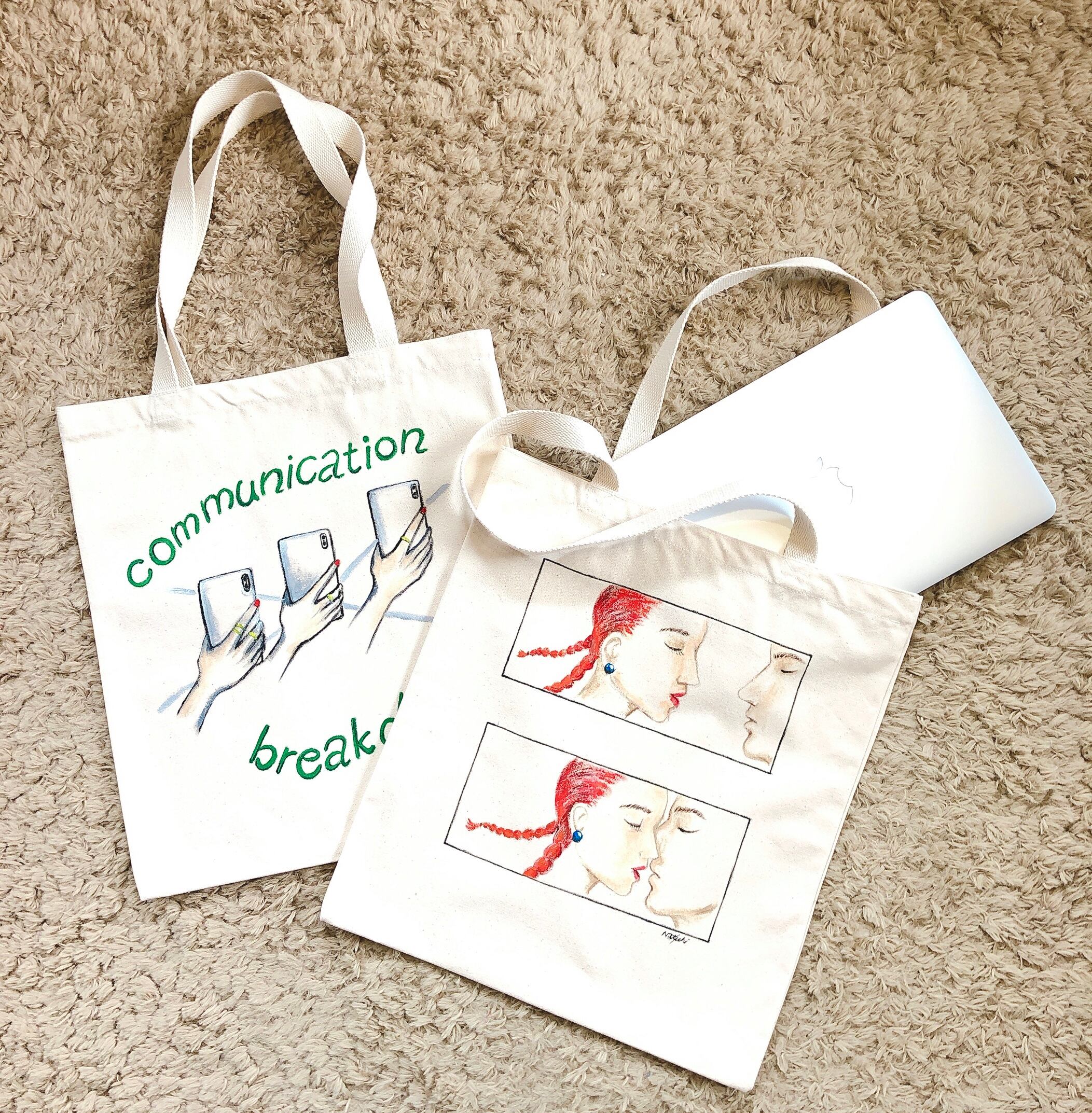 キャンバストートの上に、一点一点丁寧に直接イラストを描いて制作しています。