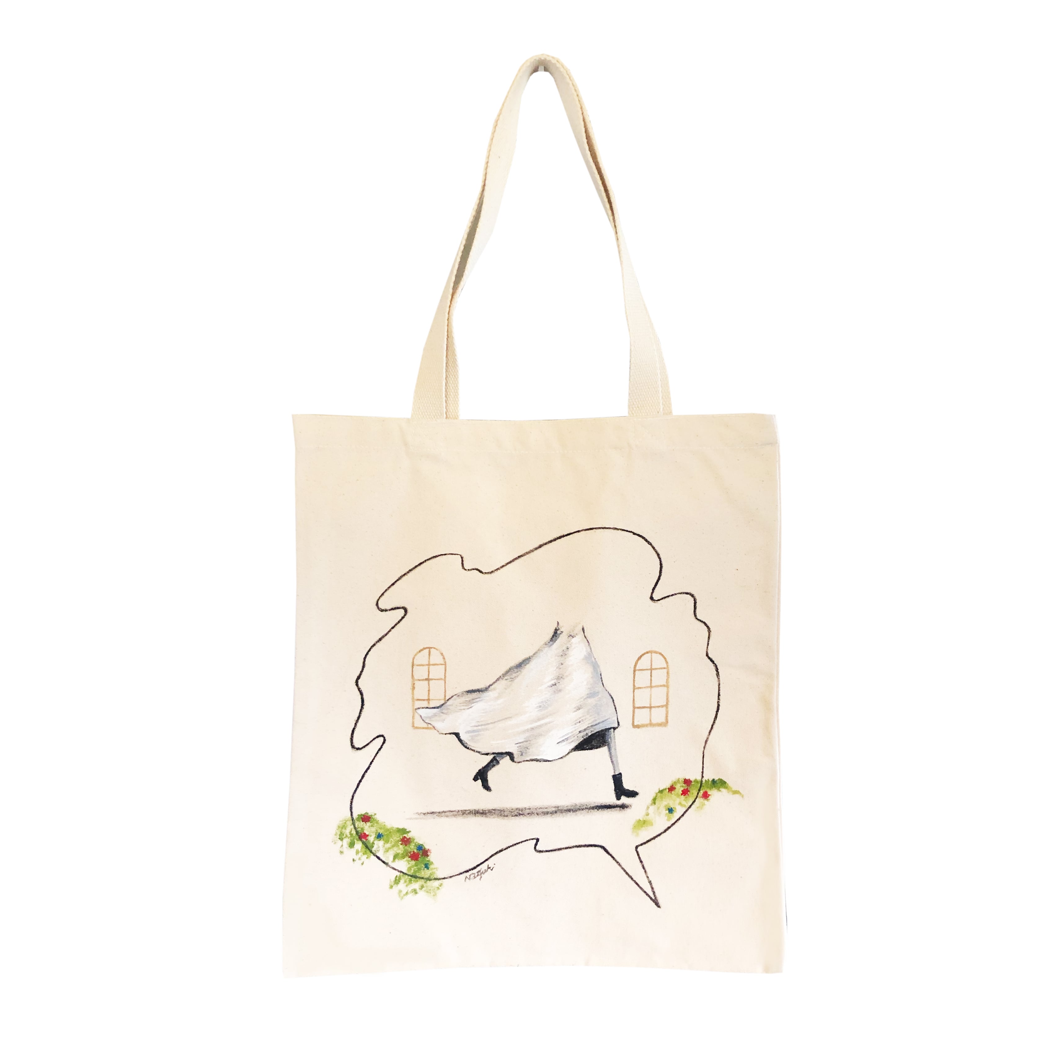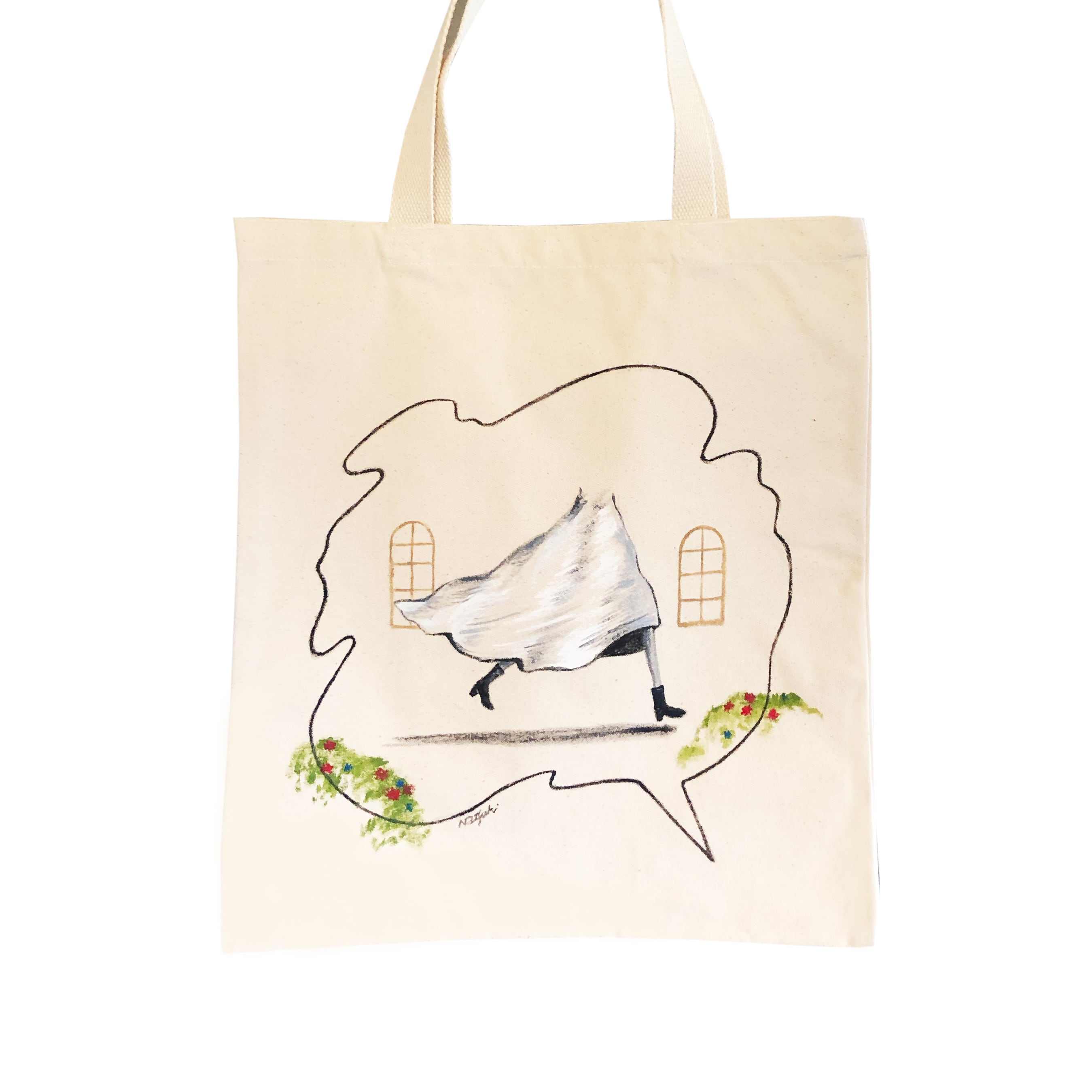 キャンバストートの上に、一点一点丁寧に直接イラストを描いて制作しています。