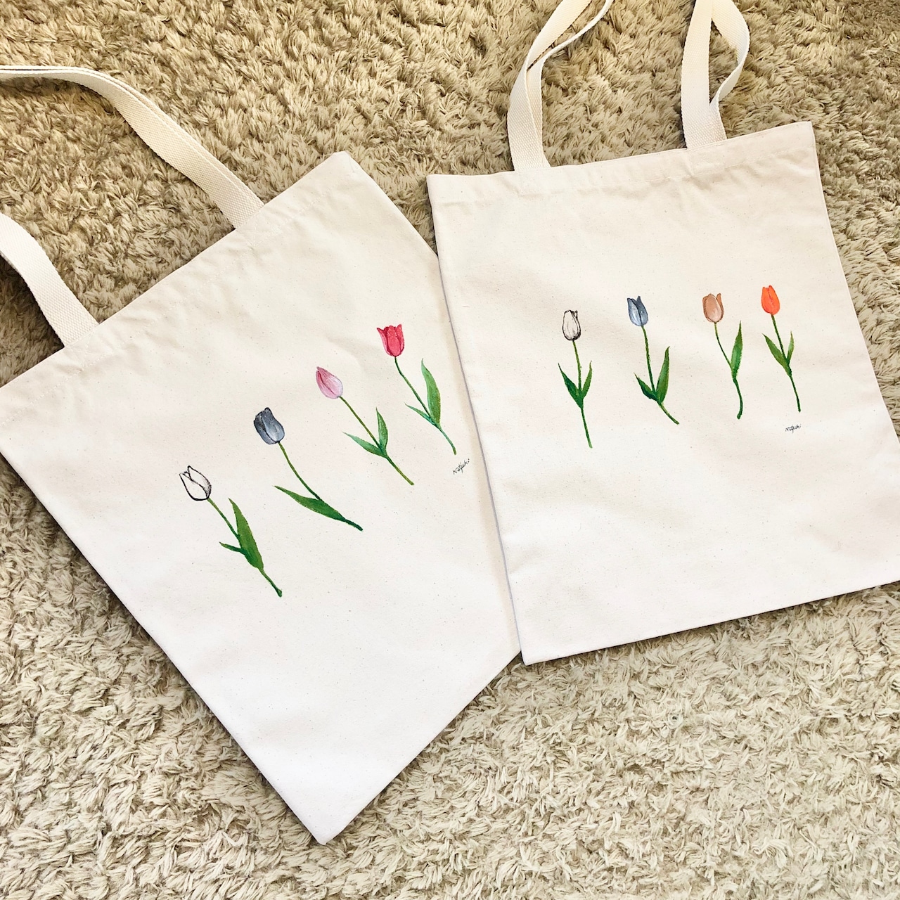 キャンバストートの上に、一点一点丁寧に直接イラストを描いて制作しています。
