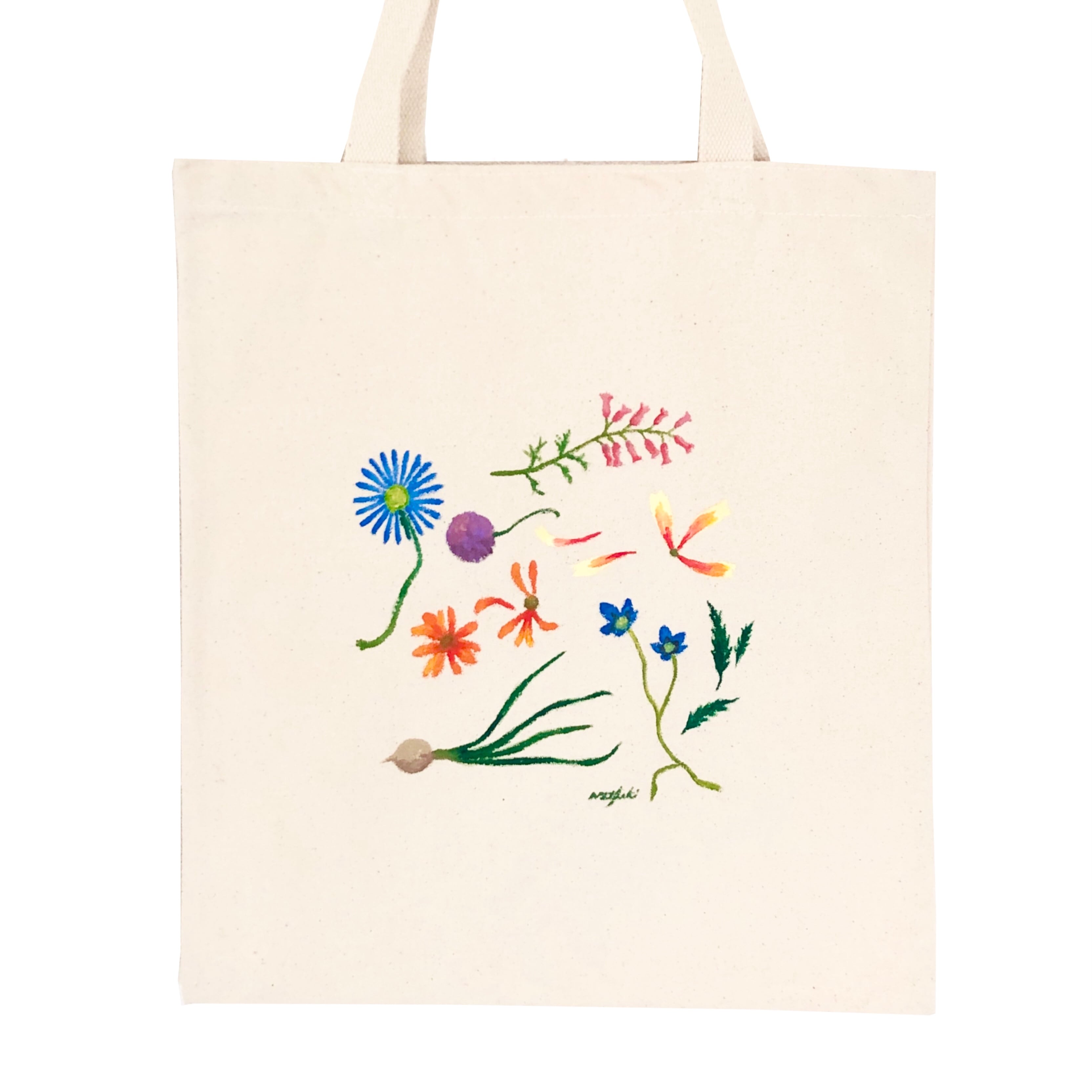 キャンバストートの上に、一点一点丁寧に直接イラストを描いて制作しています。