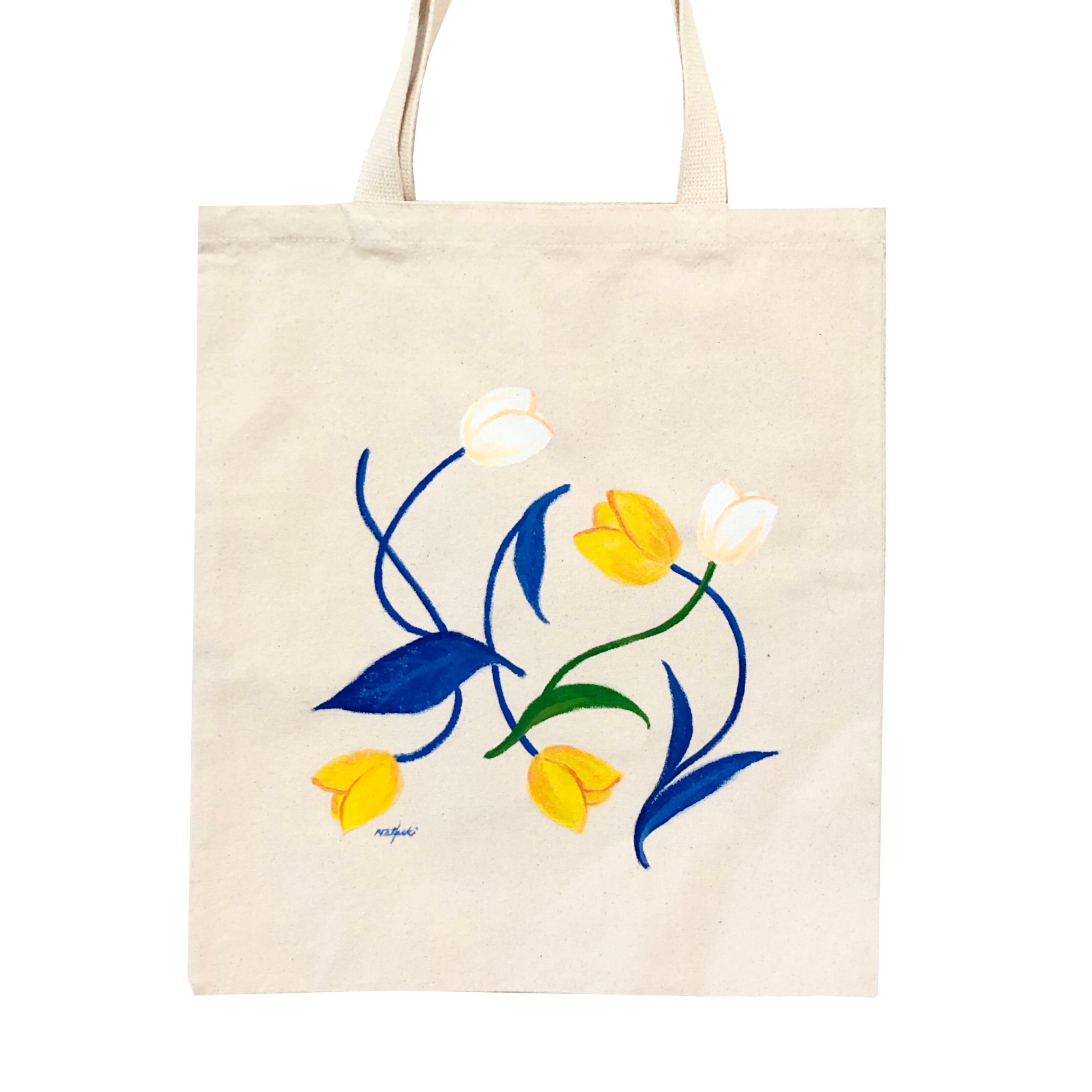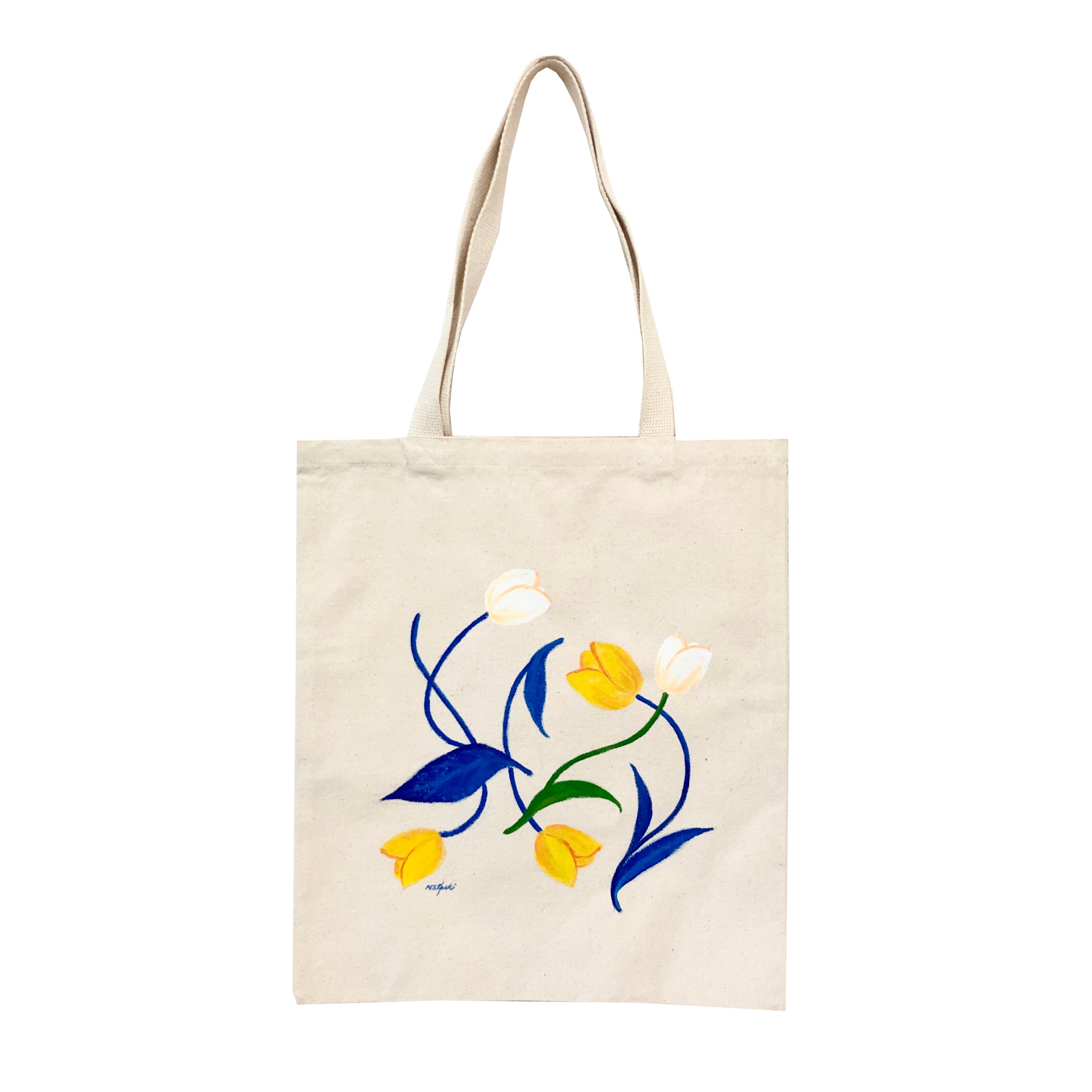 キャンバストートの上に、一点一点丁寧に直接イラストを描いて制作しています。