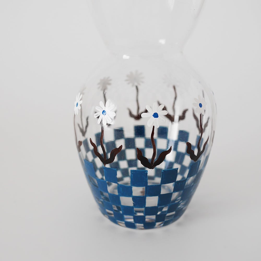 落ち着いた色合いでお花とチェッカーフラッグを花瓶全体にペイントしています。