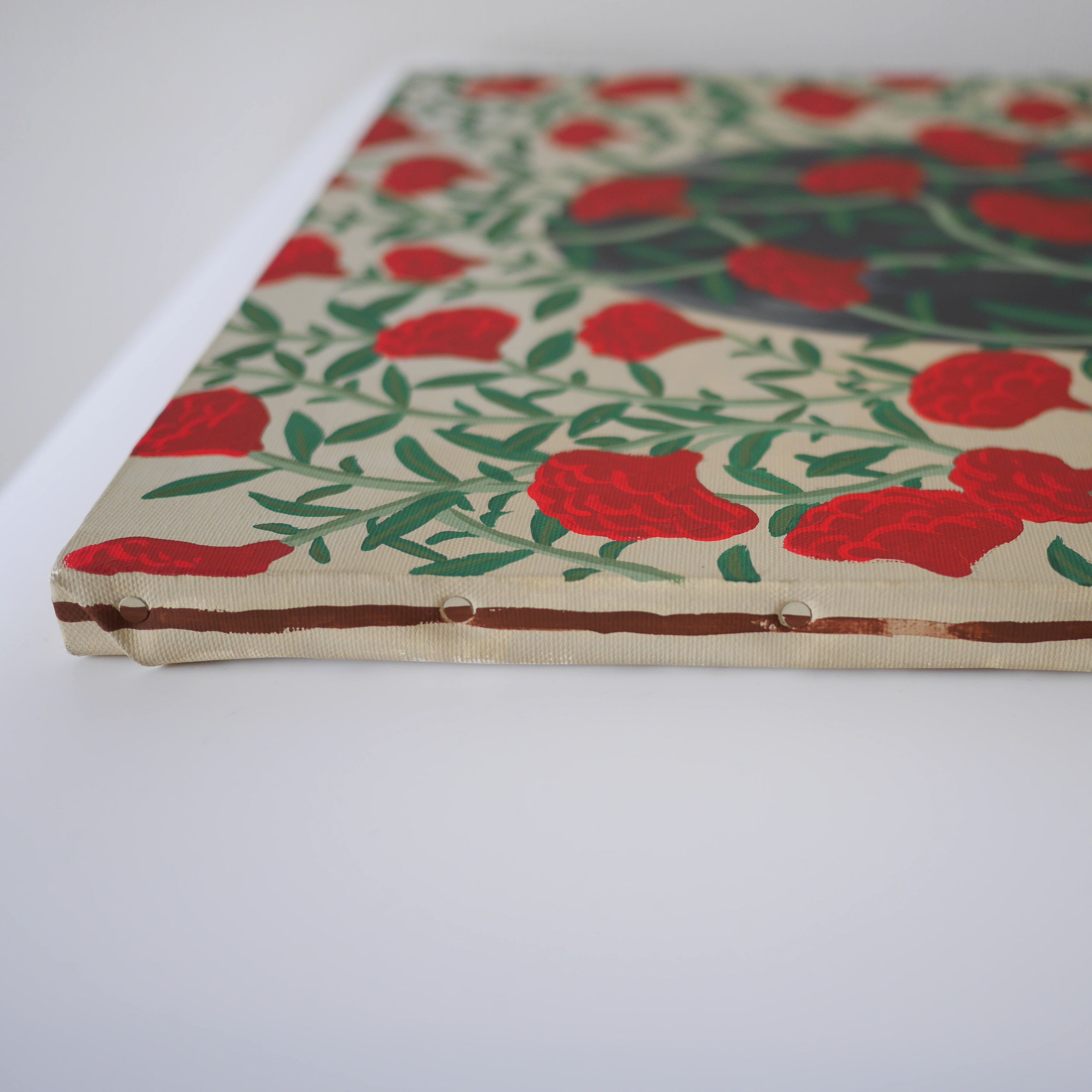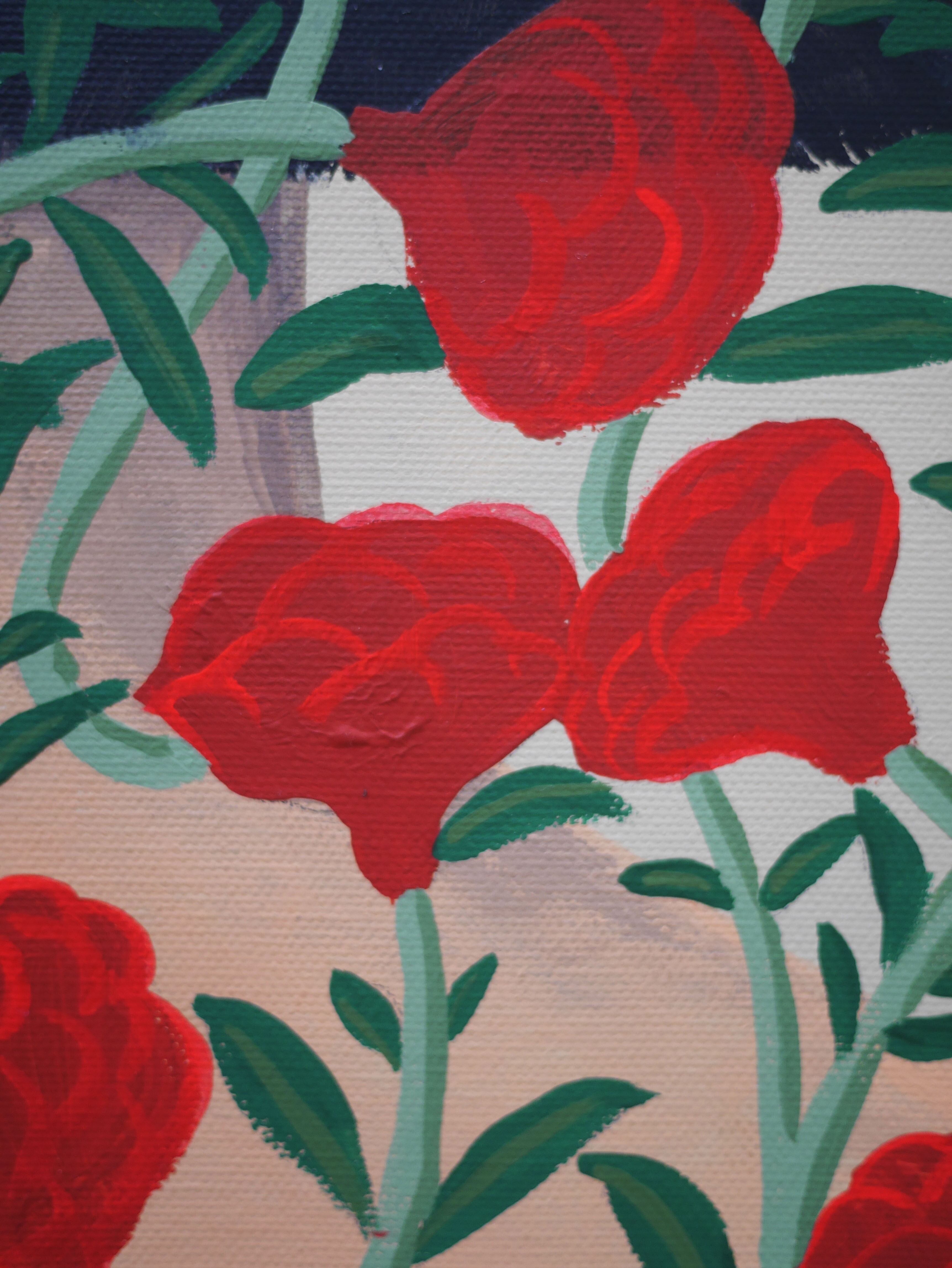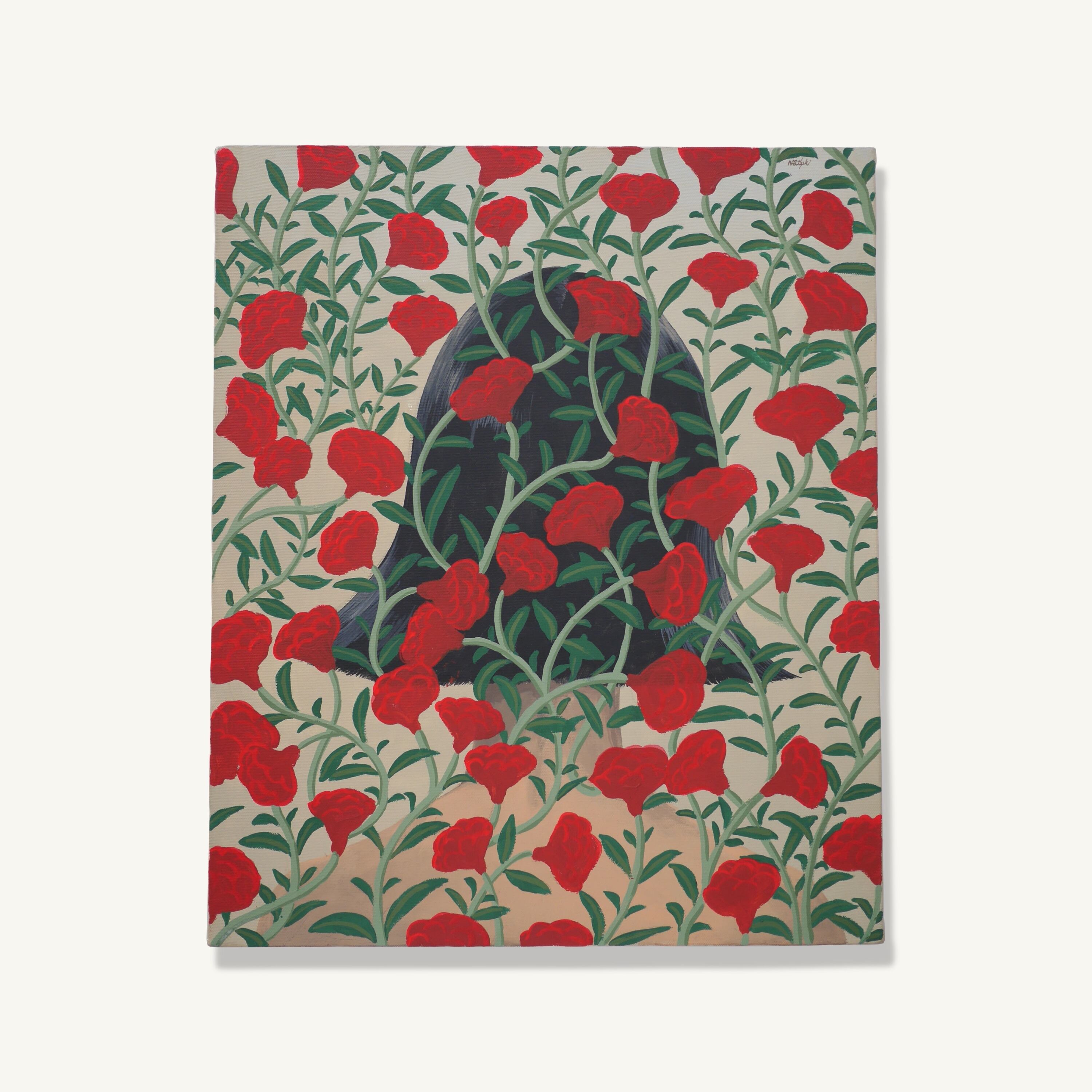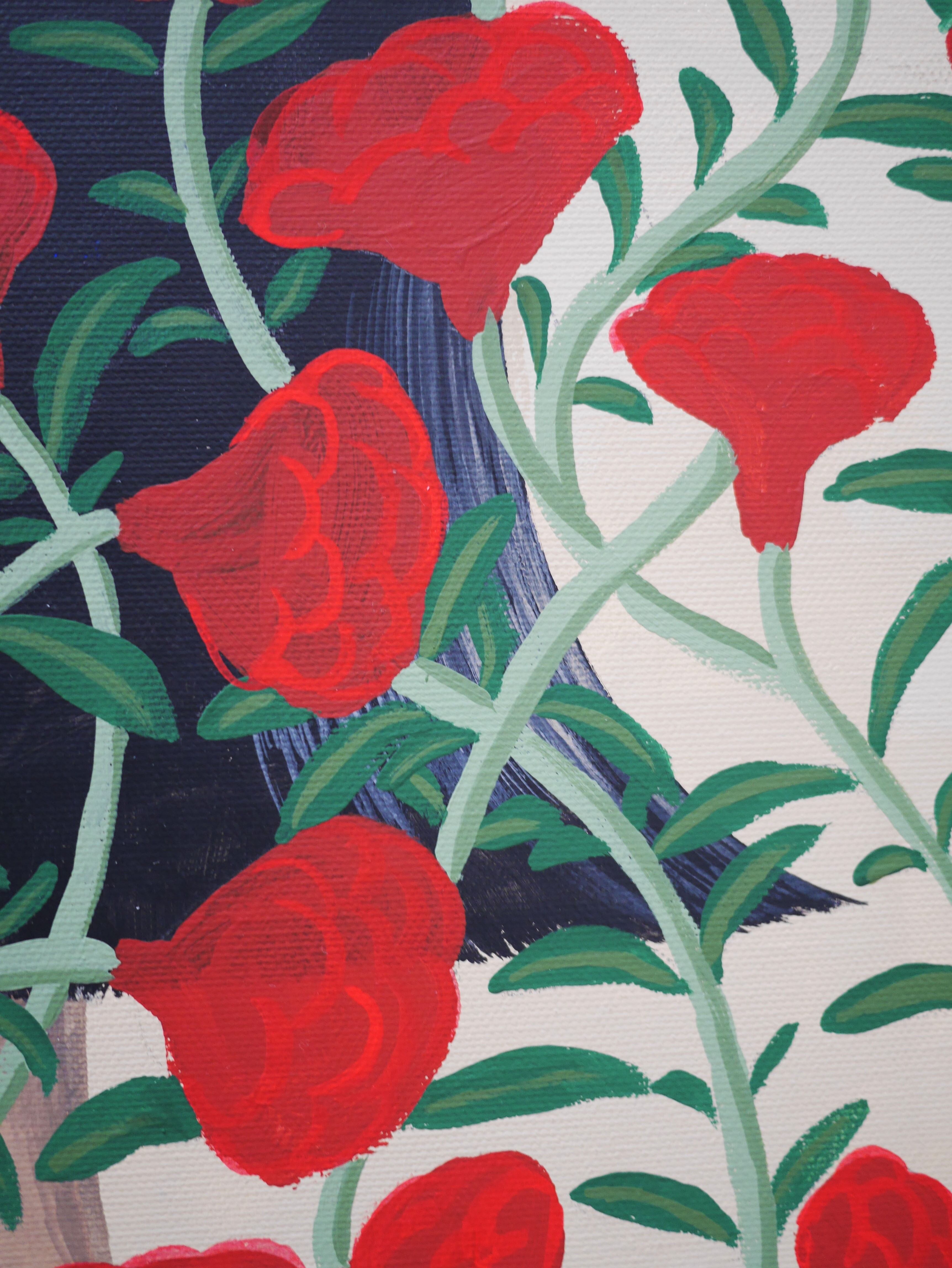 花々の後ろに女性の後ろ姿を描いた作品です。