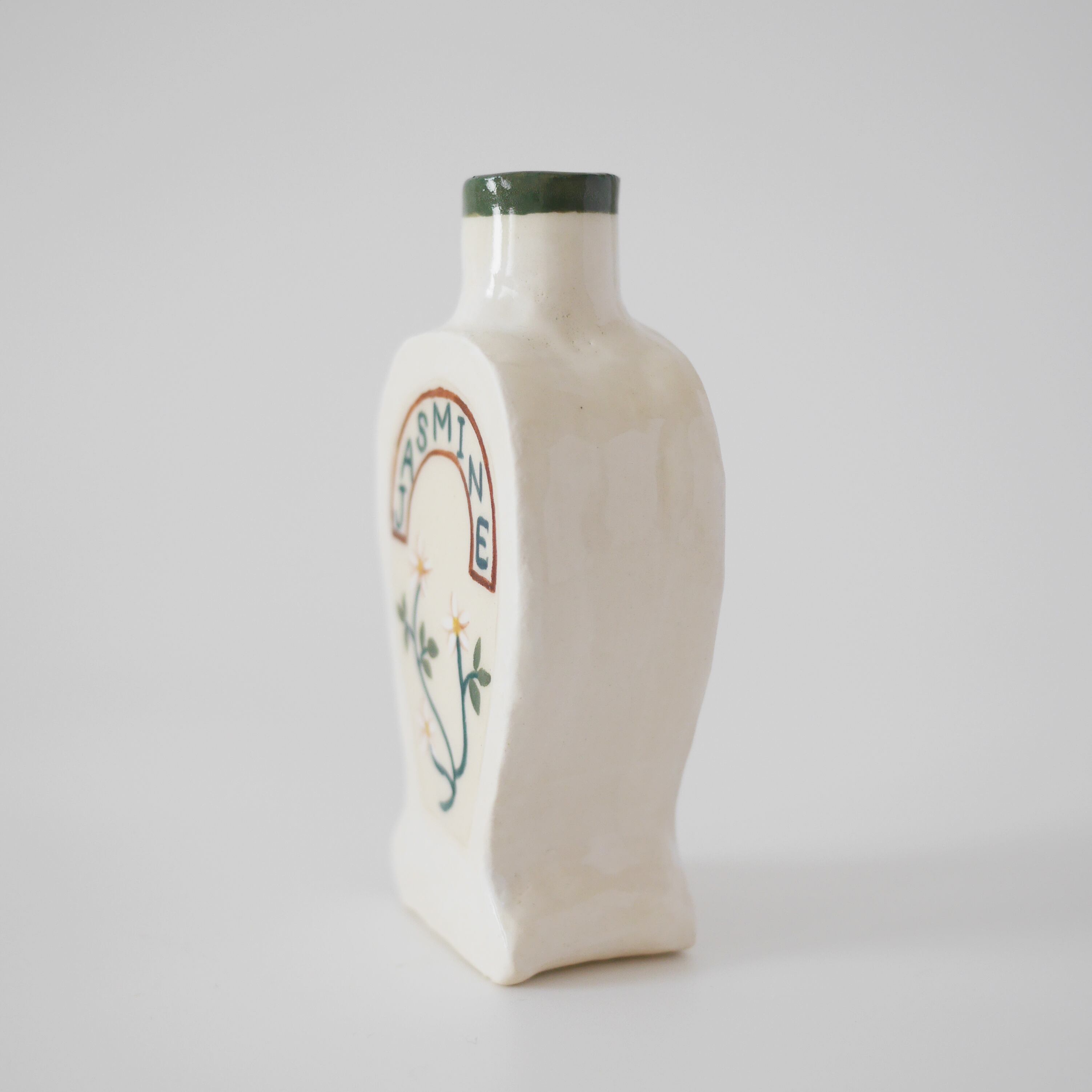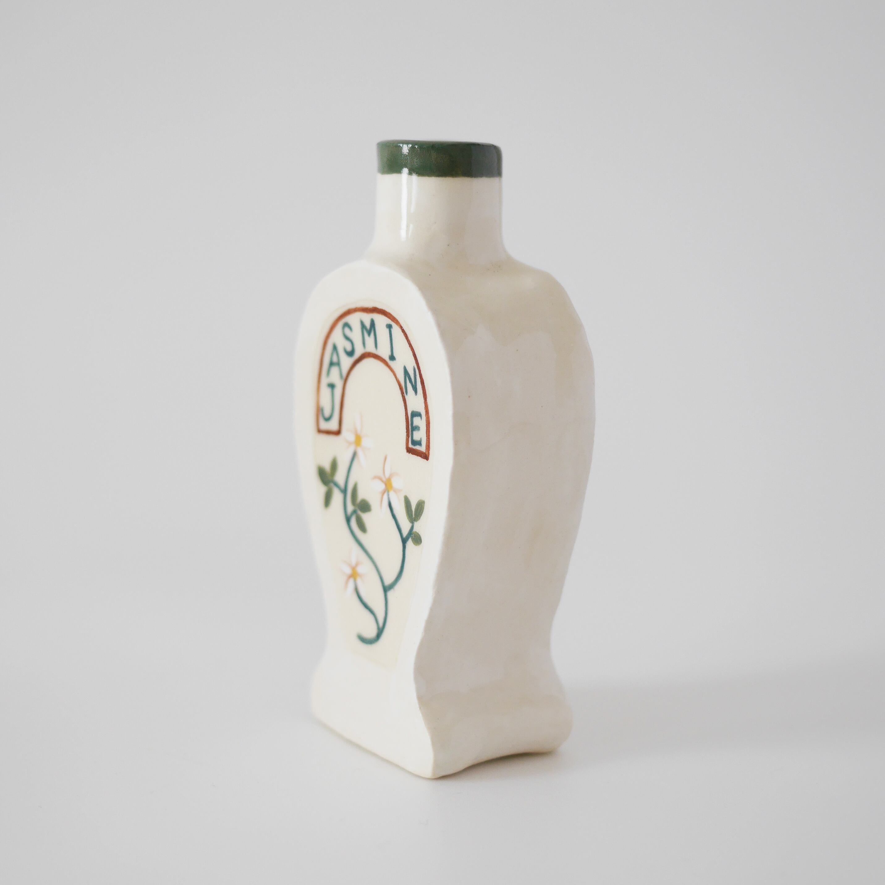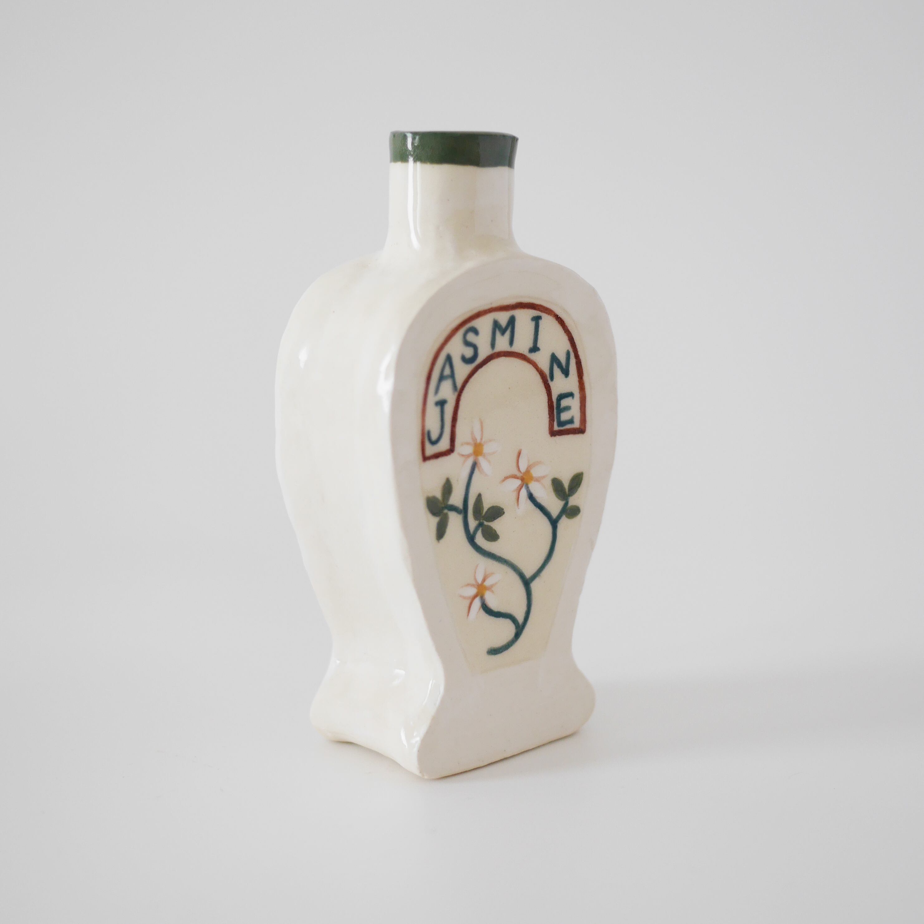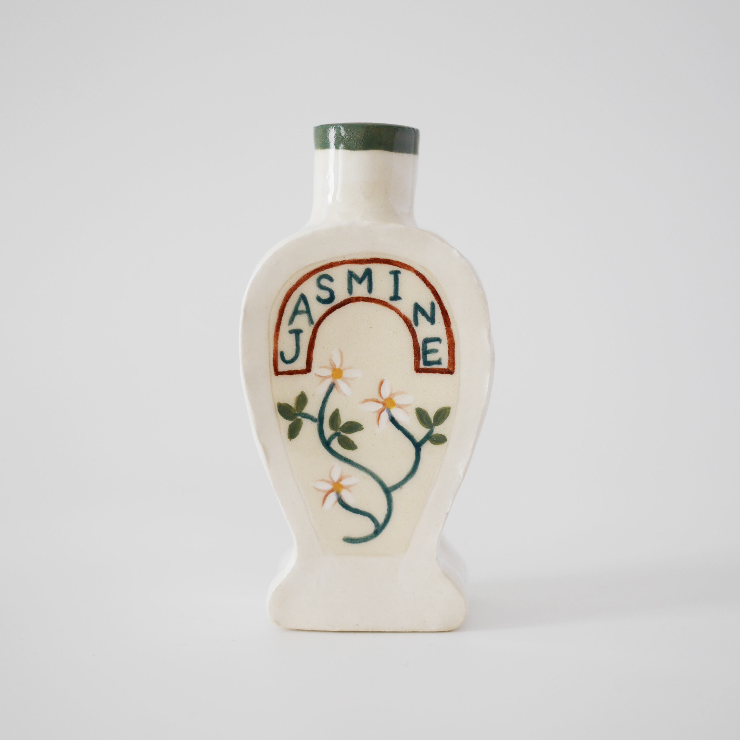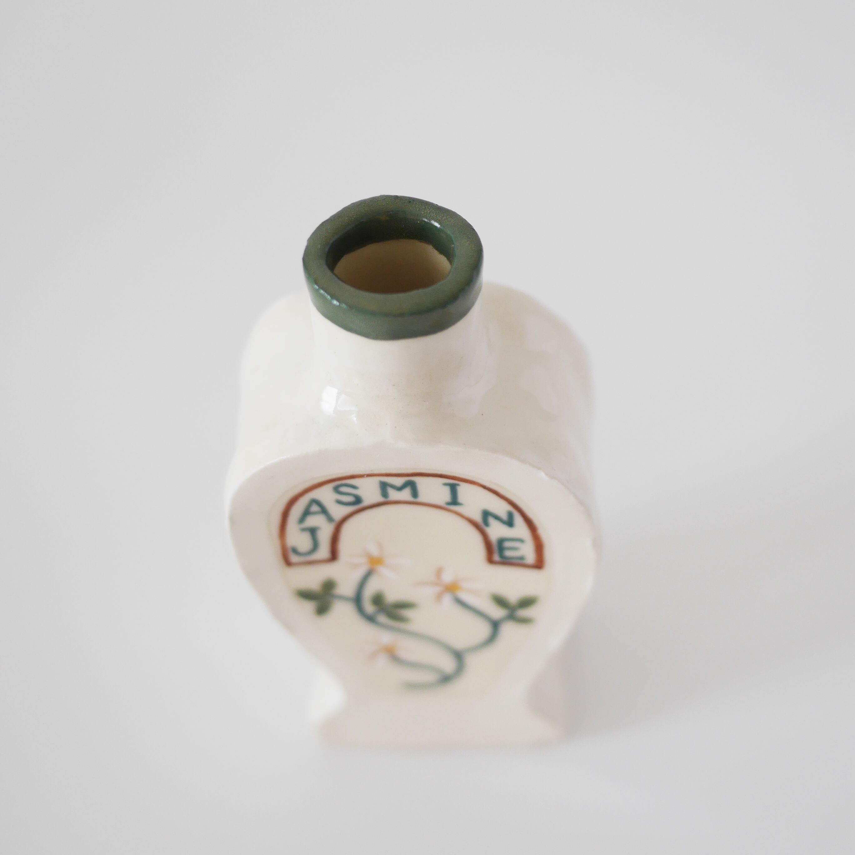 落ち着いたグリーンをベースに、ジャスミンのお花をラベル風にデザインしています。