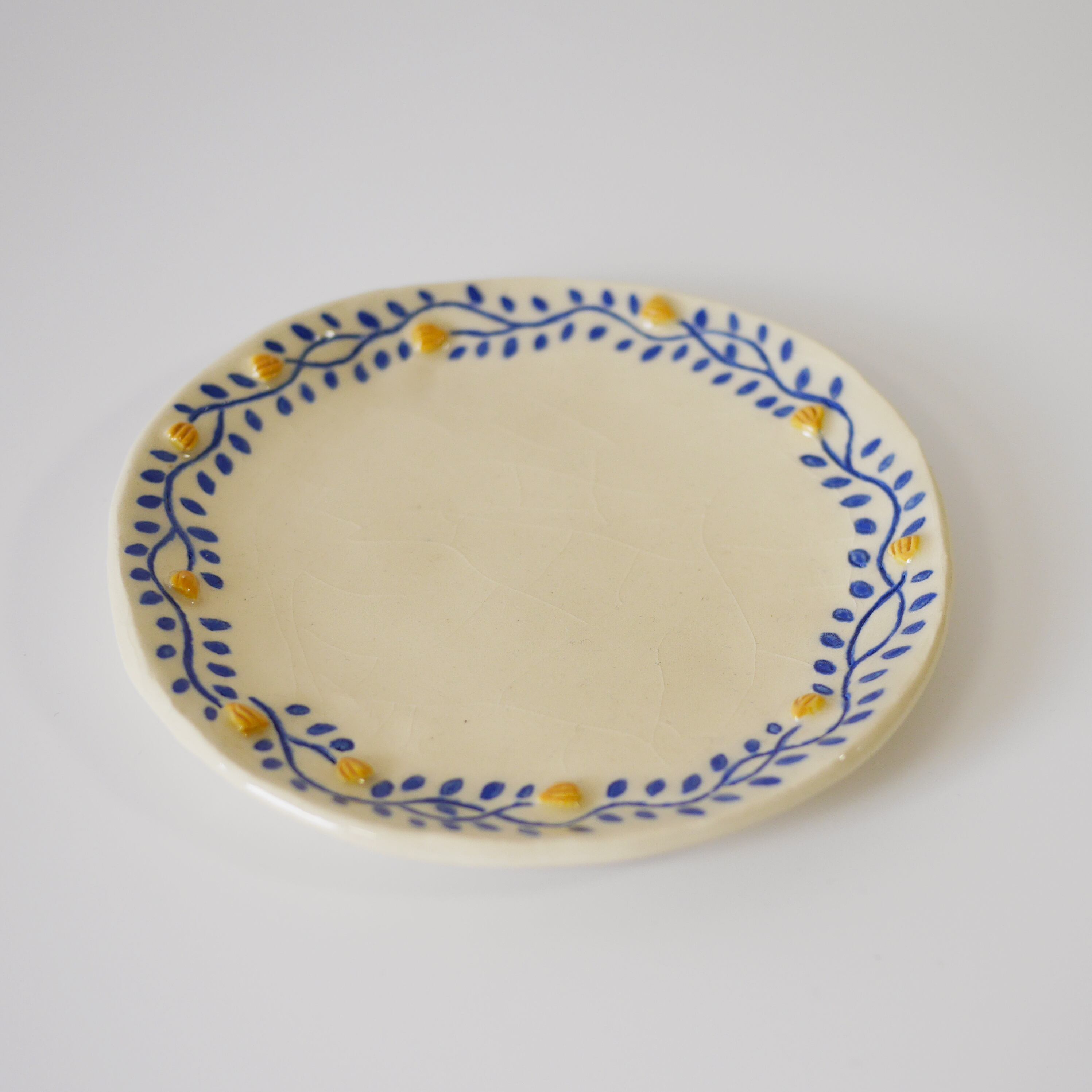 お花のイラストが周囲に入った手のひらサイズのお皿です。