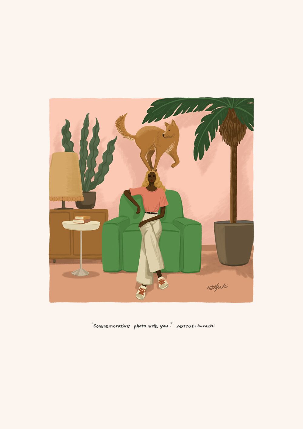 女性と頭の上に乗る犬がコミカルで可愛い作品です。