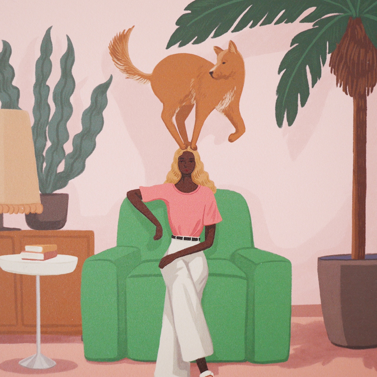 女性と頭の上に乗る犬がコミカルで可愛い作品です。
