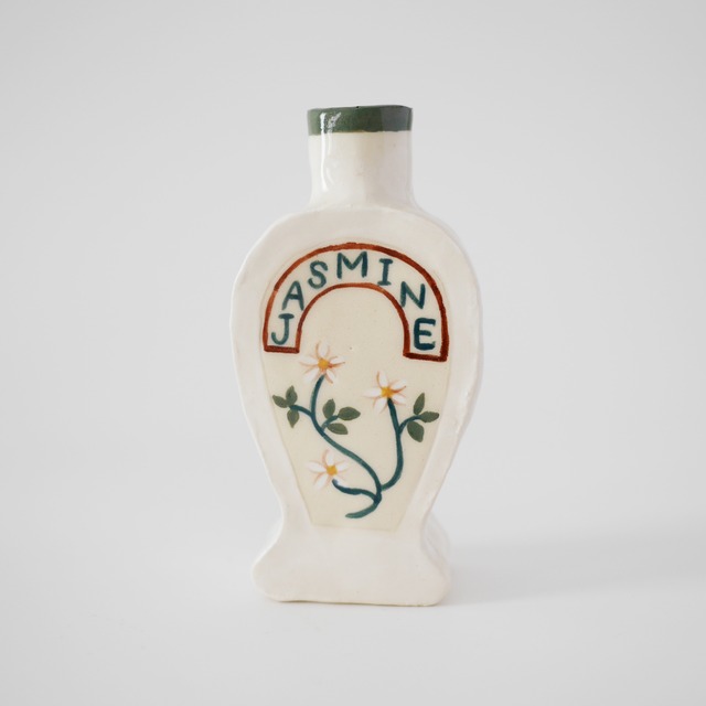 ヴィンテージのパフュームボトルをイメージした花瓶です。 ジャスミンをイメージしたイラストをラベル風に絵付けしました。 お花を飾るだけでなく、オブジェとして飾っても。 お部屋のアクセントにどうぞ。 成形から絵付けまで、ひとつひとつ丁寧に手作りしています。 サイズ:H9.5cm/W6cm /口径1cm 素材:陶器 小ぶりで茎の細いお花でしたら2本ほど、茎が太めのお花は1本ほど飾ることができます。 [注意事項] こちらをよくご確認の上ご注文くださいませ。 *フラワーベースやお皿、箸置きは水漏れ防止剤を施しておりますので目止めの処理は必要ありませんが、水漏れ防止剤は永久防水ではございませんので、効果が薄れた場合に目止めをお試しください。 *食洗機、電子レンジは使用しないでください。 *写真と多少色味が異なる場合がございます。 *一点ものの作品となっております。売り切れ次第販売終了となります。 *ラッピングは承っておりません。 *返品、交換は受け付けておりません。 *ハンドメイドの作品となりますので、1点1点多少のサイズの誤差がありますことをご了承ください。 *制作中に発生した微量の塗料のハネや色ハゲがあることがございます。 *These products are not available for international shipping. 【発送について】 ご注文日の翌日〜3日以内の発送を予定しております。 なお、作品の制作から梱包・発送まで全て1人で作業を行っているため、場合により発送日が前後する可能性がございます。 ご了承いただけますと幸いです。